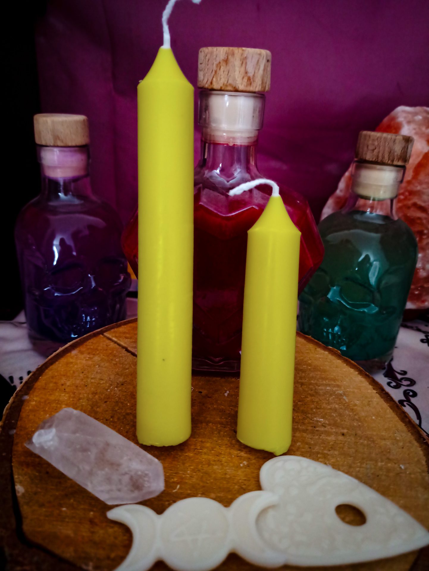 Illuminez votre intellect et votre clarté mentale avec notre bougie jaune « Lueurs Sacrées », idéale pour les rituels de connaissance et de confiance.