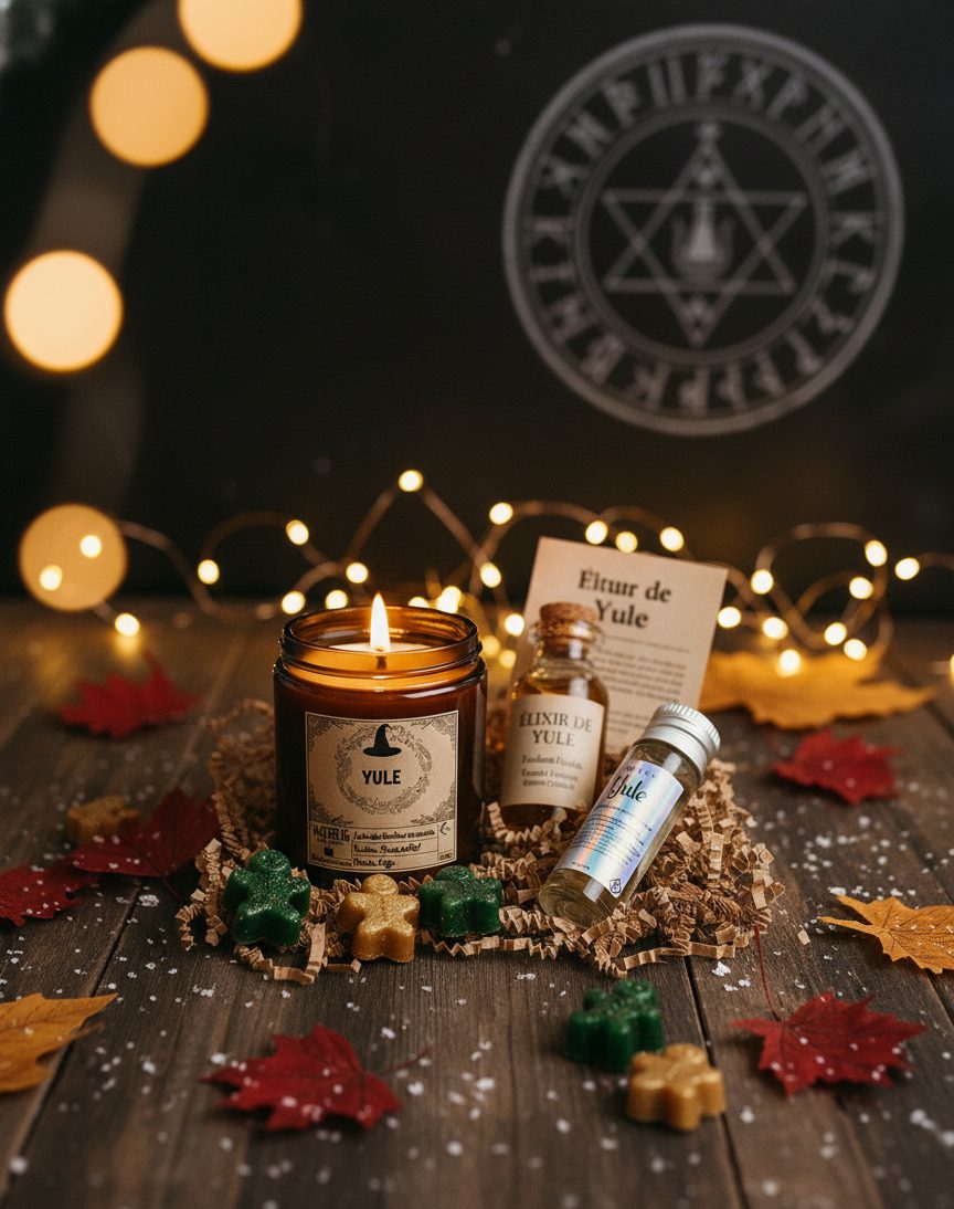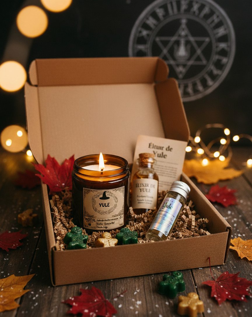 Une box magique pour célébrer Yule : bougie Épices de Noël, fondant liquide Élixir de Yule et huile rituelle de L’Écho Éternel du Feu. Chaleur, lumière et spiritualité.