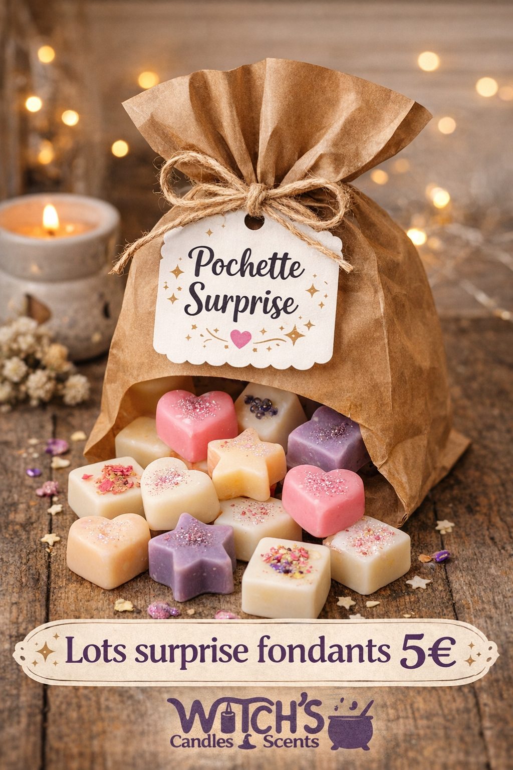 Découvrez un lot surprise de 5 fondants parfumés Witch’s Candles & Scents, idéal pour tester plusieurs senteurs ou se faire plaisir à petit prix.